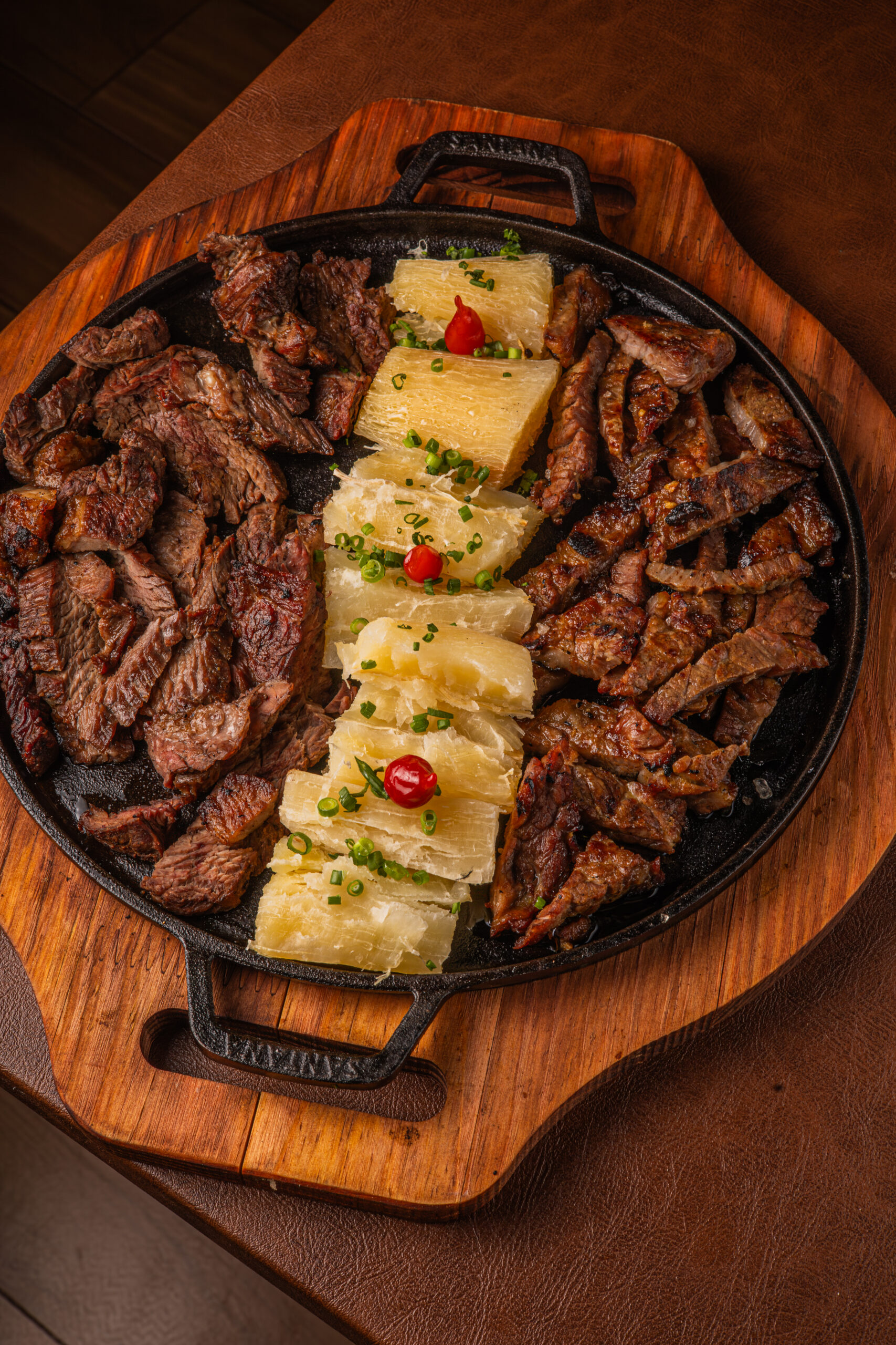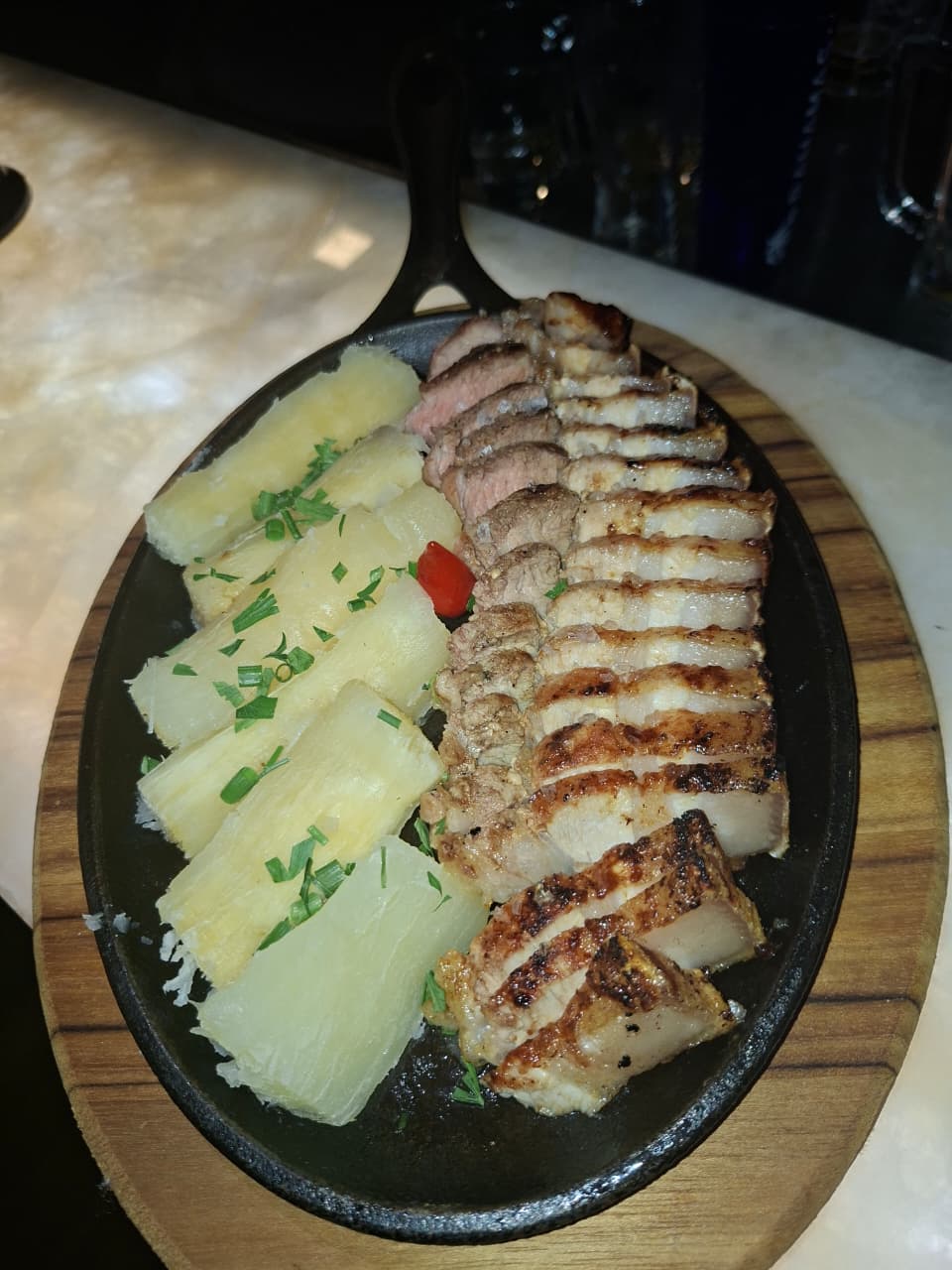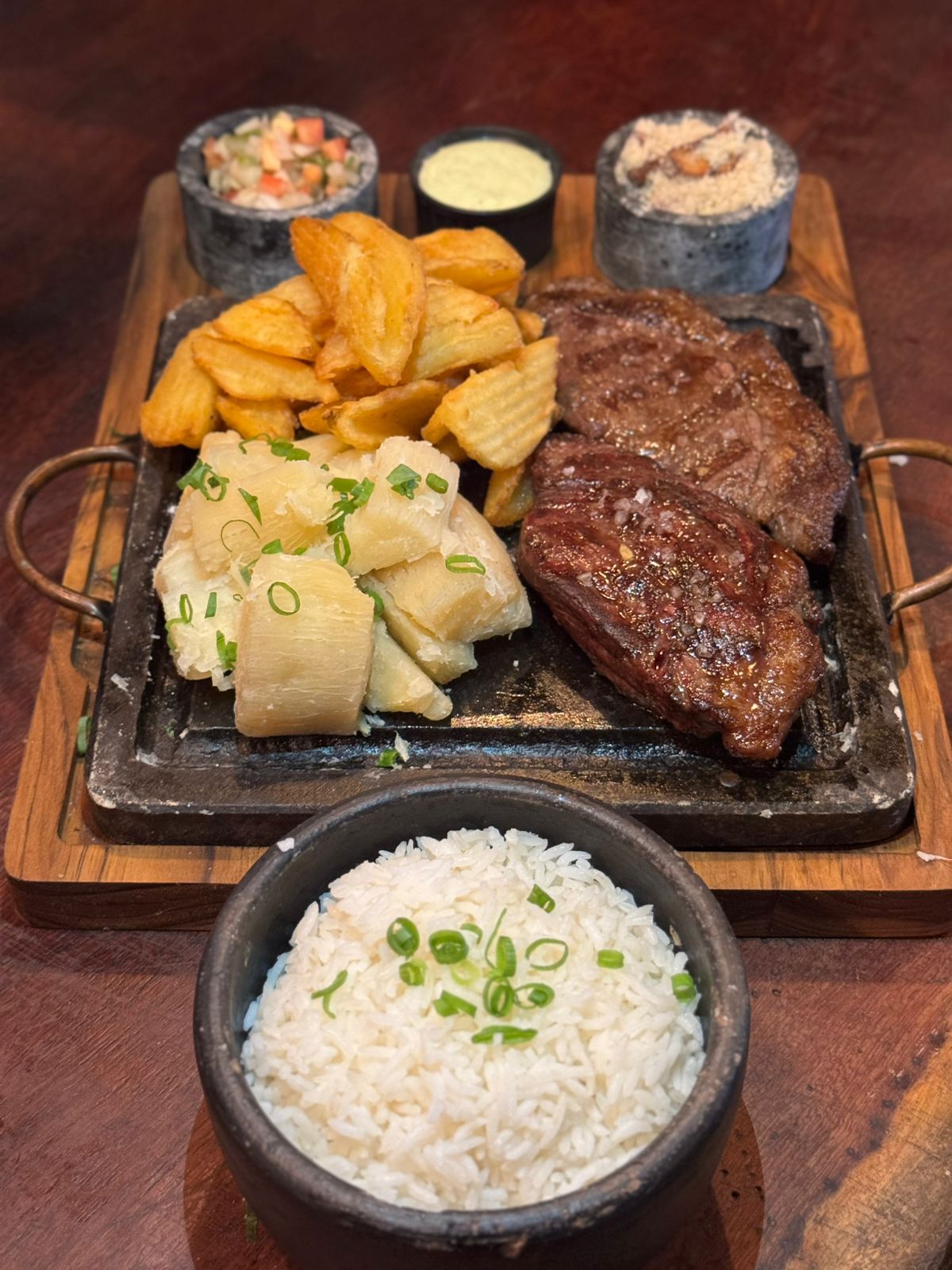 500 gramas de picanha, batata rústica  e mandioca cozida.