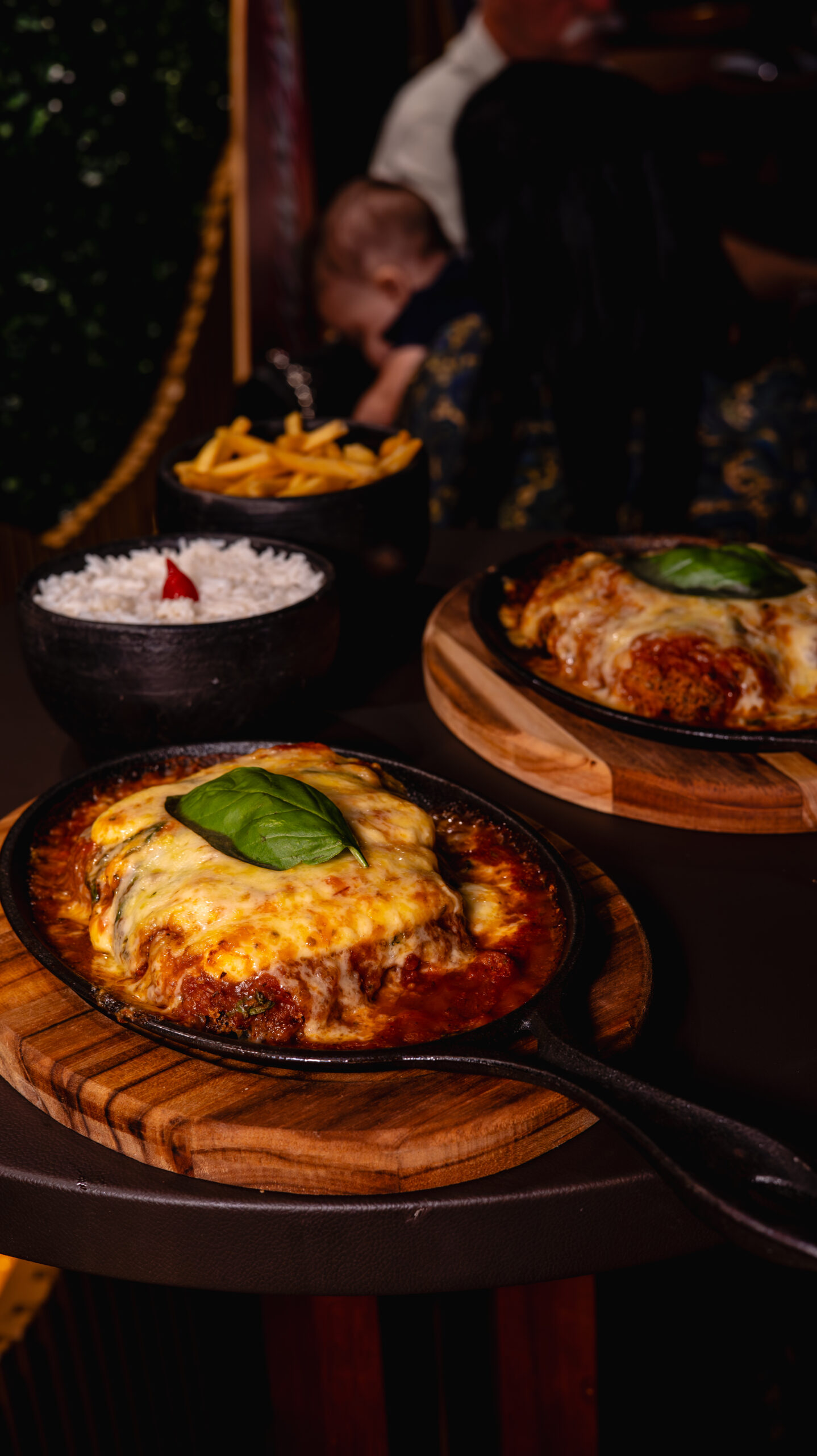 Filé mignon empanado, coberto com molho caseiro, queijo muçarela gratinado. Acompanha arroz e batata frita. Serve 2 pessoas.