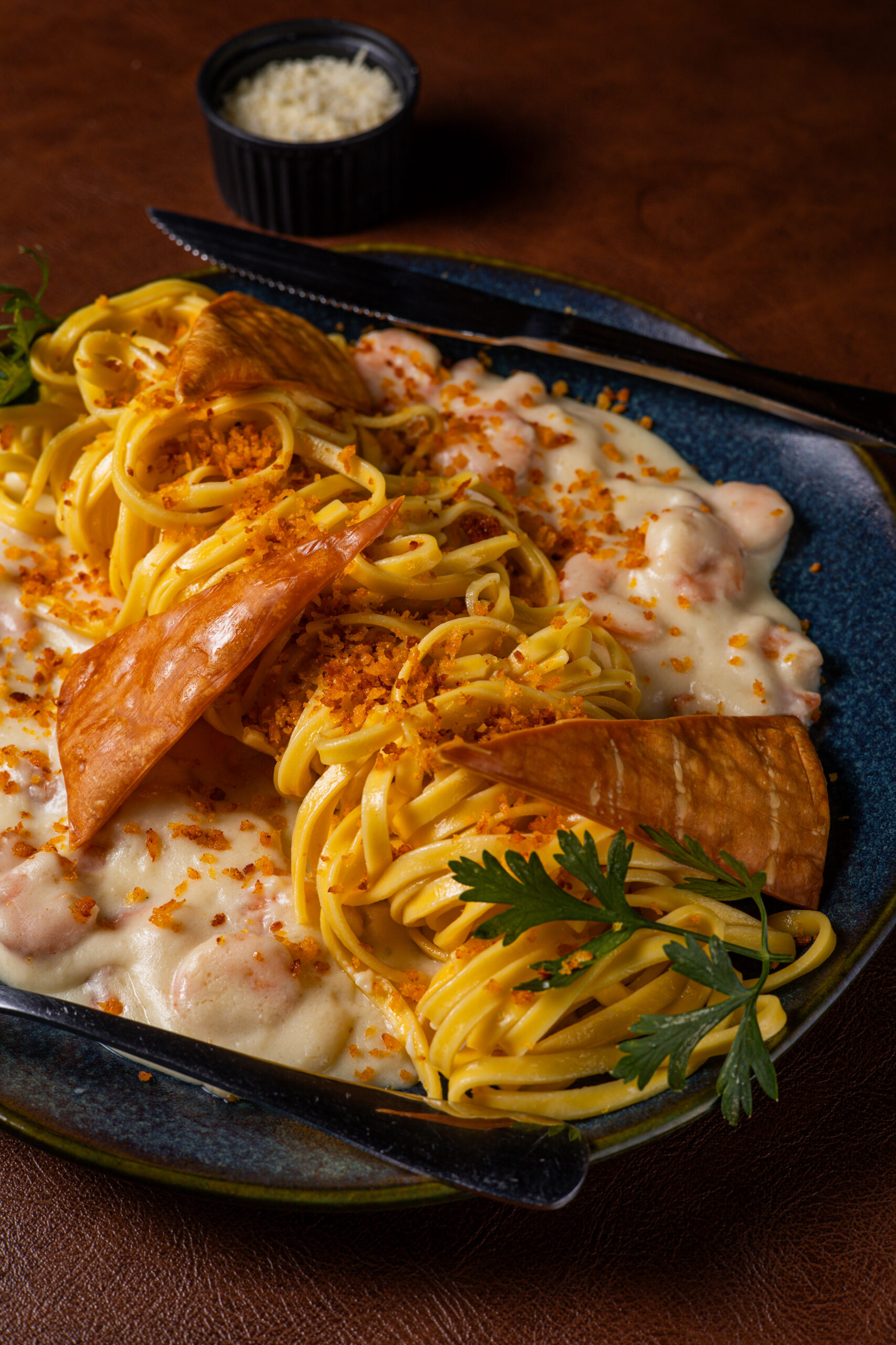 MOLHO BRANCO COM PARMESÃO, CAMARÕES E FINALIZADO COM FAROFA CROCANTE.