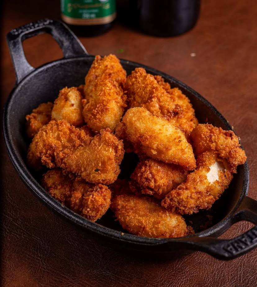 Bolinho de costela desfiada com mandioca e queijo empanado e frito. Porção com 10 unidades, aproximadamente 500 gramas.
