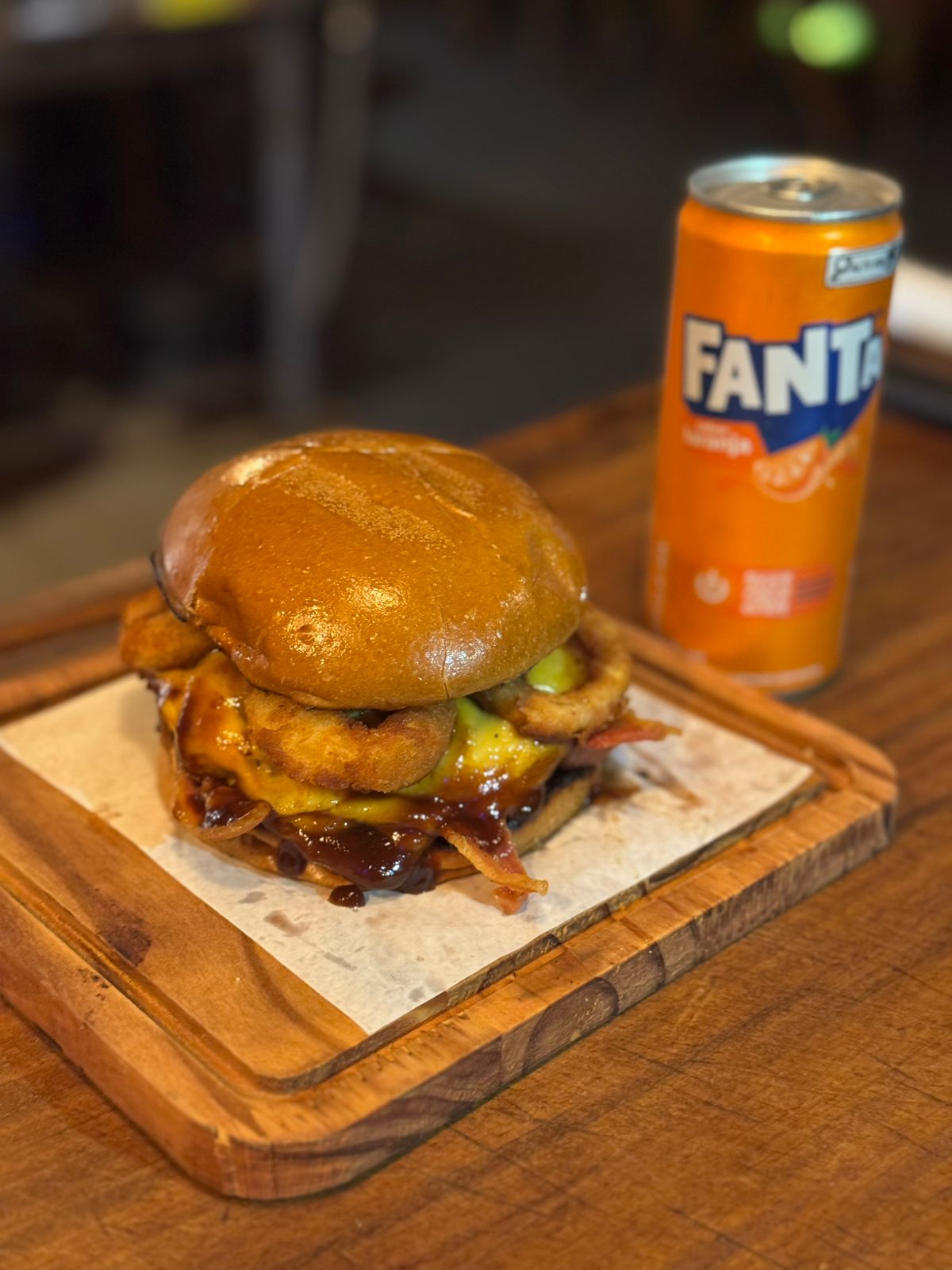 Maionese de alho, hamburguer de 180g, queijo prato, molho barbecue, finalizado com anéis de cebola.