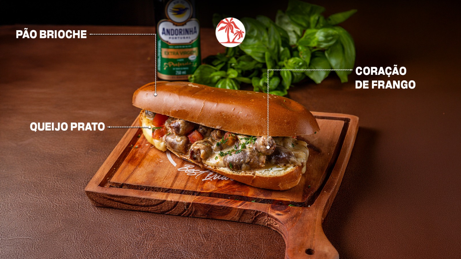 Pão brioche, queijo prato e coração de frango
