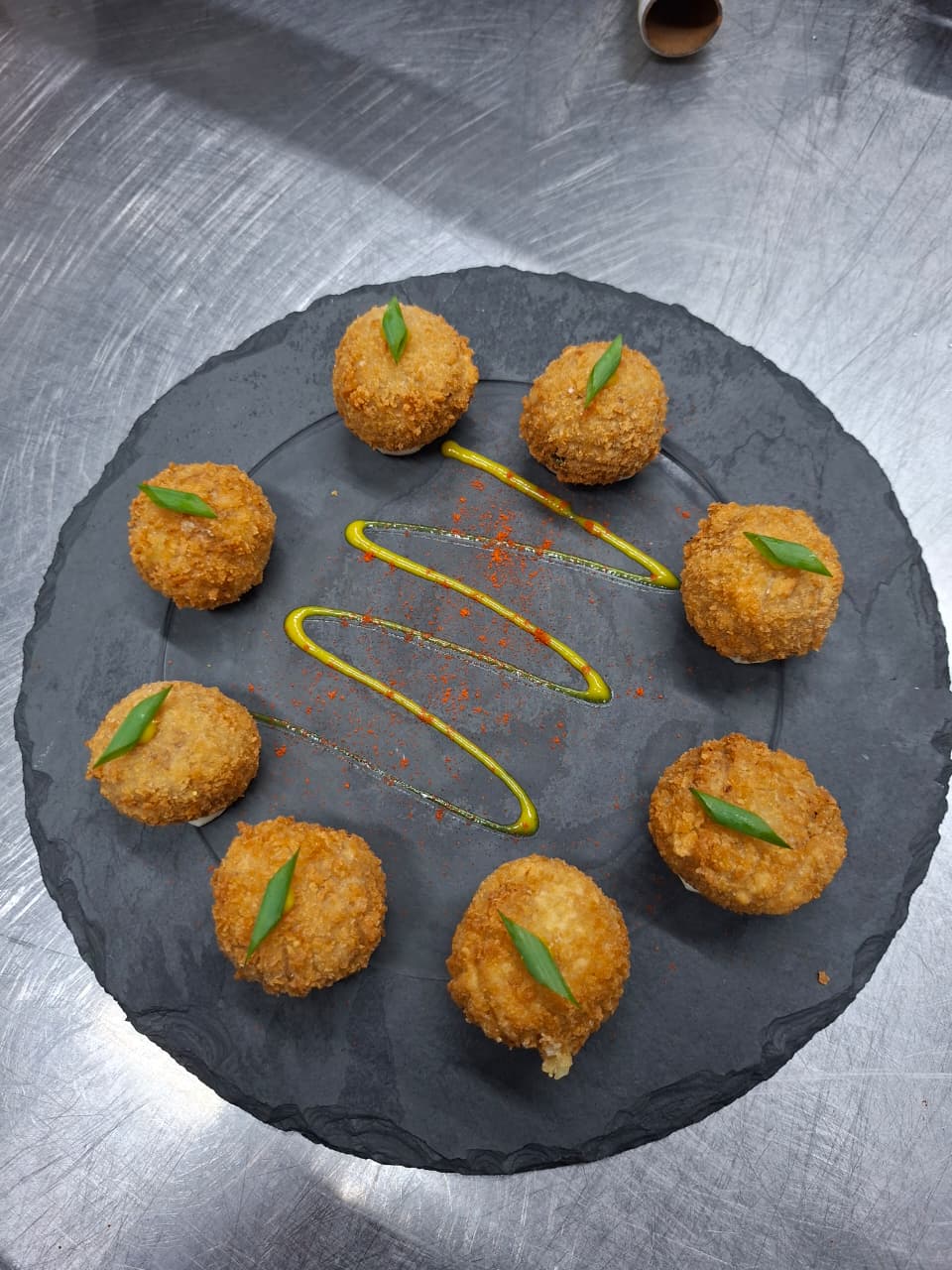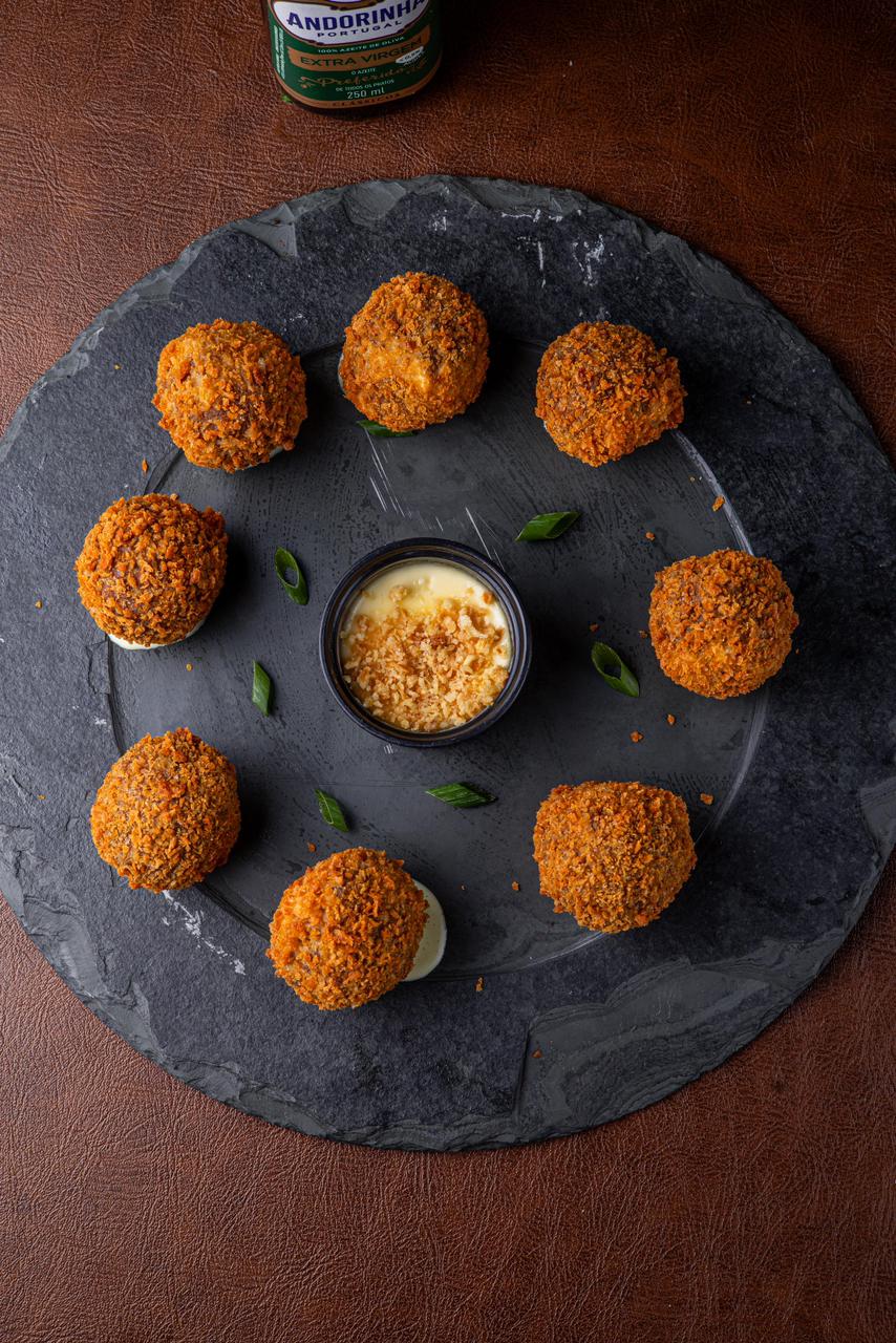 Bolinho de carne, recheado com queijo e empanado na farinha Panko.