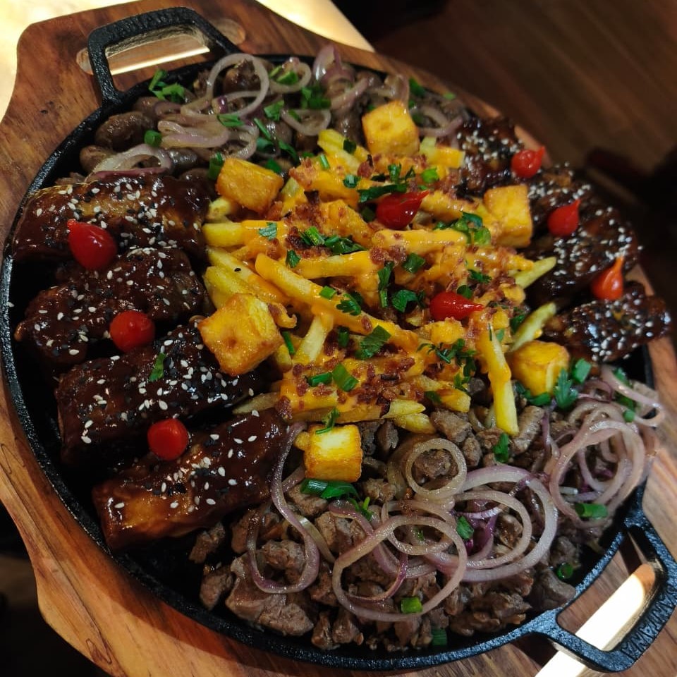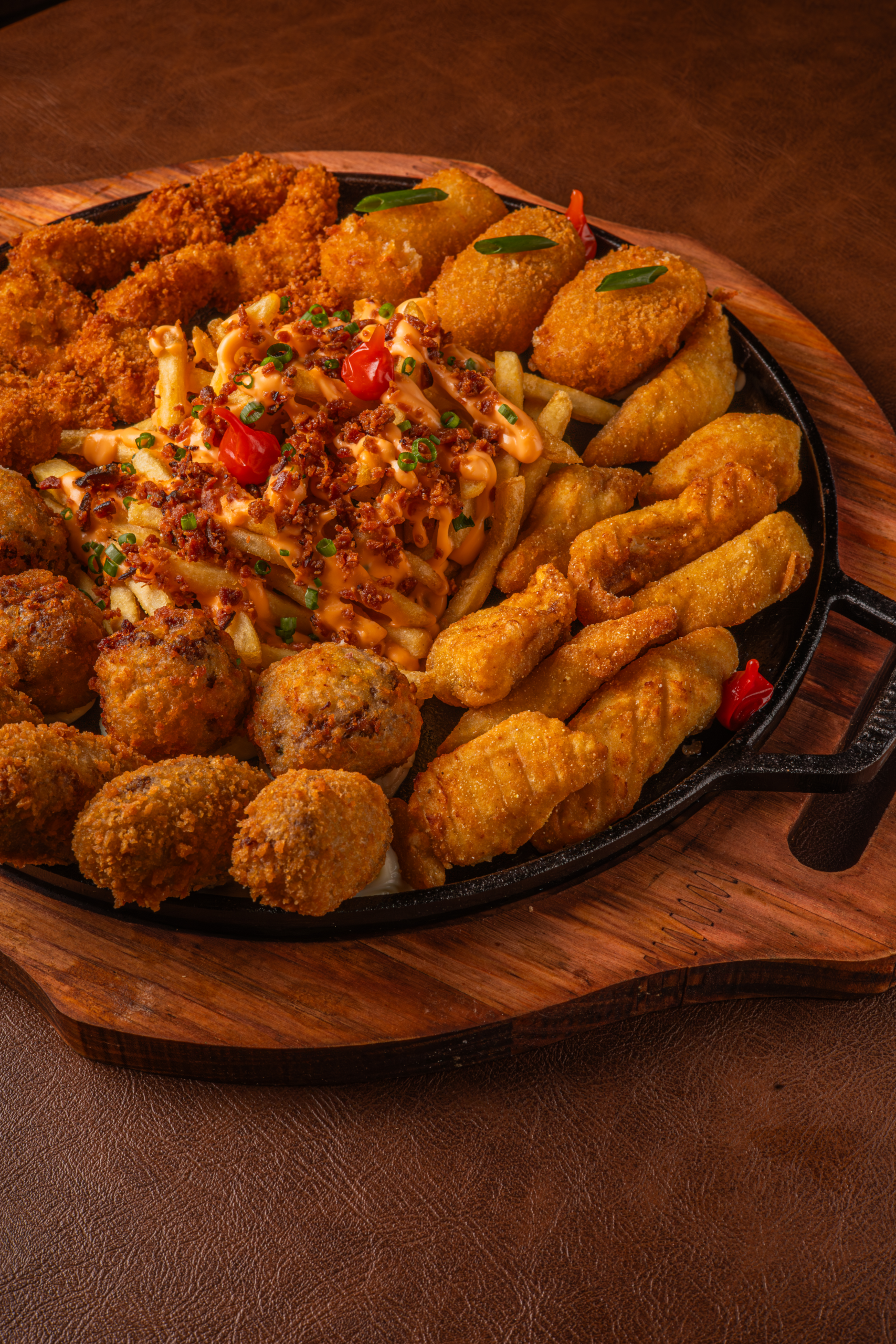 Mix especial com coração de galinha acebolado, costelinha suína ao barbecue, iscas de filé mignon, queijo coalho em cubos e batata frita com cheddar e bacon.